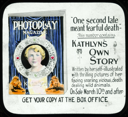 "One second late meant fearful death - This number contains Kathlyn's own story. Written by herself - illustrated with thrilling pictures of her facing snarling, vicioos, death dealing wild animals. On sale March 10 and after. Get your copy at the box office."