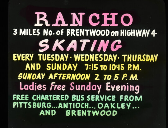 "Rancho Skating. 3 miles no. of Brentwood on Highway 4. Every Tuesday, Wednesday, Thursday, and Sunday 7:15 to 10:15 pm. Ladies free Sunday evening. Free chartered bus service from Pittsburgh... Antioch... Oakley... and Brentwood"