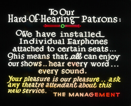 "To our Hard-Of-Hearing Patrons: We have installed individual earphones attached to certain seats... This means that all can enjoy our shows... hear every word... every sound. Your pleasure is our pleasure.. ask any theatre attendant about this new service."